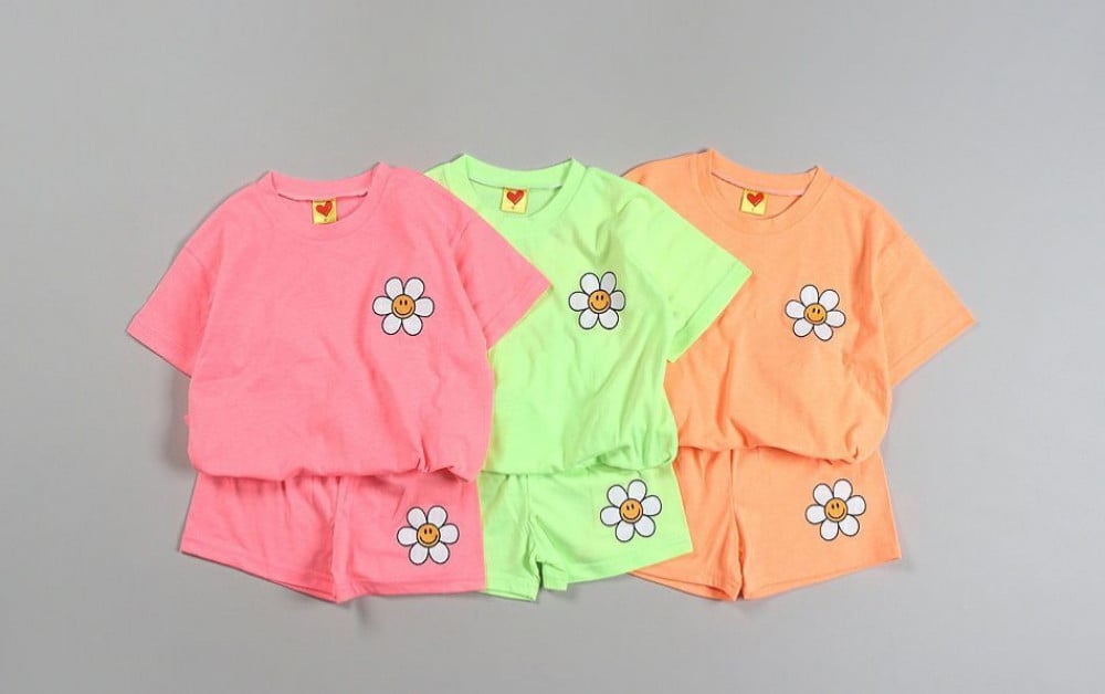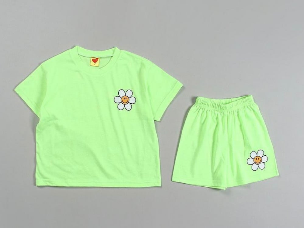 • التصميم: تيشيرت بأكمام قصيرة مع شورت بنفس اللون، مزين بطبعة زهرة مبتسمة على الجهتين.